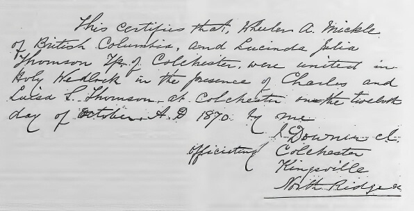 Wheeler married Lucinda Julia Thomson of Colchester, British Columbia, in October 1870. He took up land in the Nicola Valley of British Columbia. There, their four children, Lennox, Charles, Eddy and Tina were born. In 1881 he came back to what is now Alberta, where he freighted between Fort Walsh and Calgary for the North West Mounted Police. He settled in Calgary and built one of the first dwelling houses there. About the time that the town began to grow, he built a stable and entered into the feed and dray business. When the Mission property facing Seventeenth Avenue was put on the market, he purchased a site and built there.
