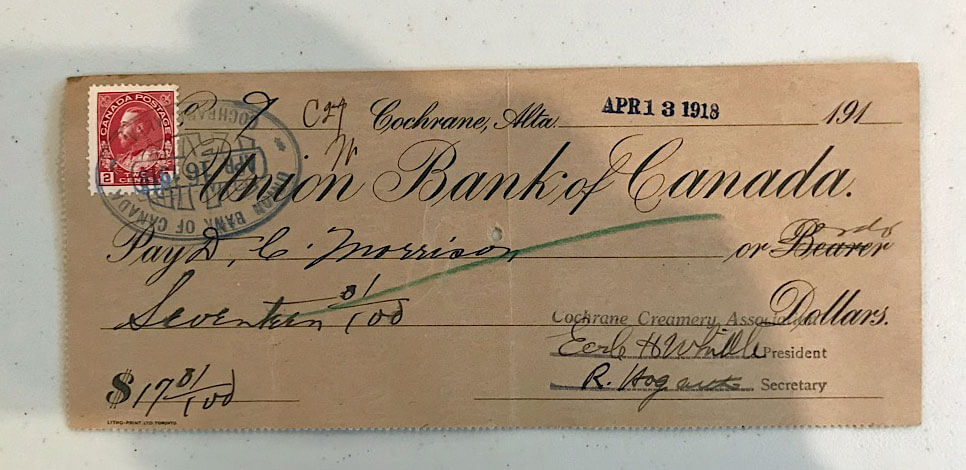 Ken Hall recently contacted us about some items from his father’s things. He has a couple of cheques from the early 1900s issued by the Cochrane Creamery. We jumped at the chance to save another relic of the history of our town.